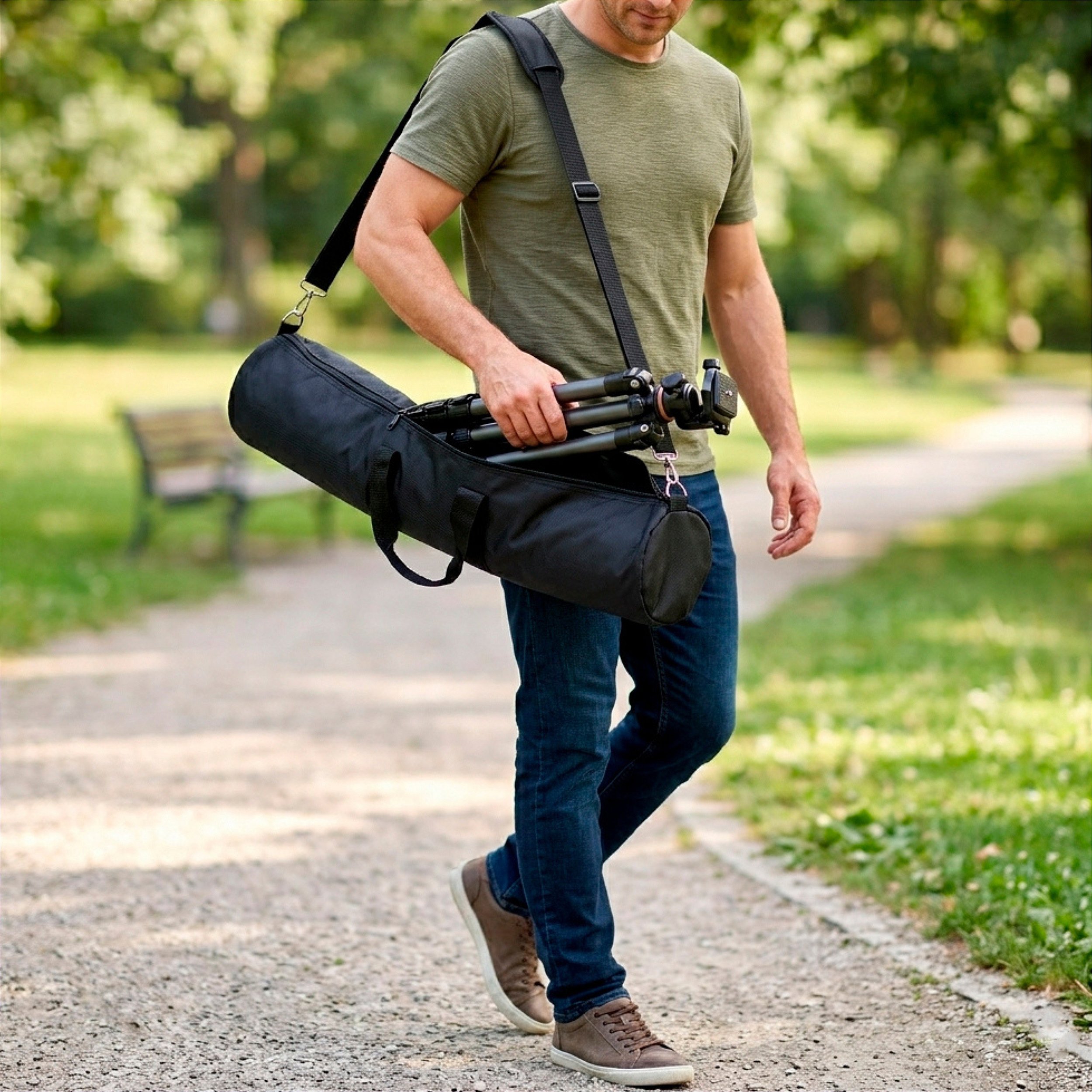 Com opções que variam de 50 cm até 120 cm, a bolsa acomoda o tripé de forma firme, oferecendo proteção contra poeira, umidade e impactos leves, preservando o equipamento durante o transporte ou armazenamento.