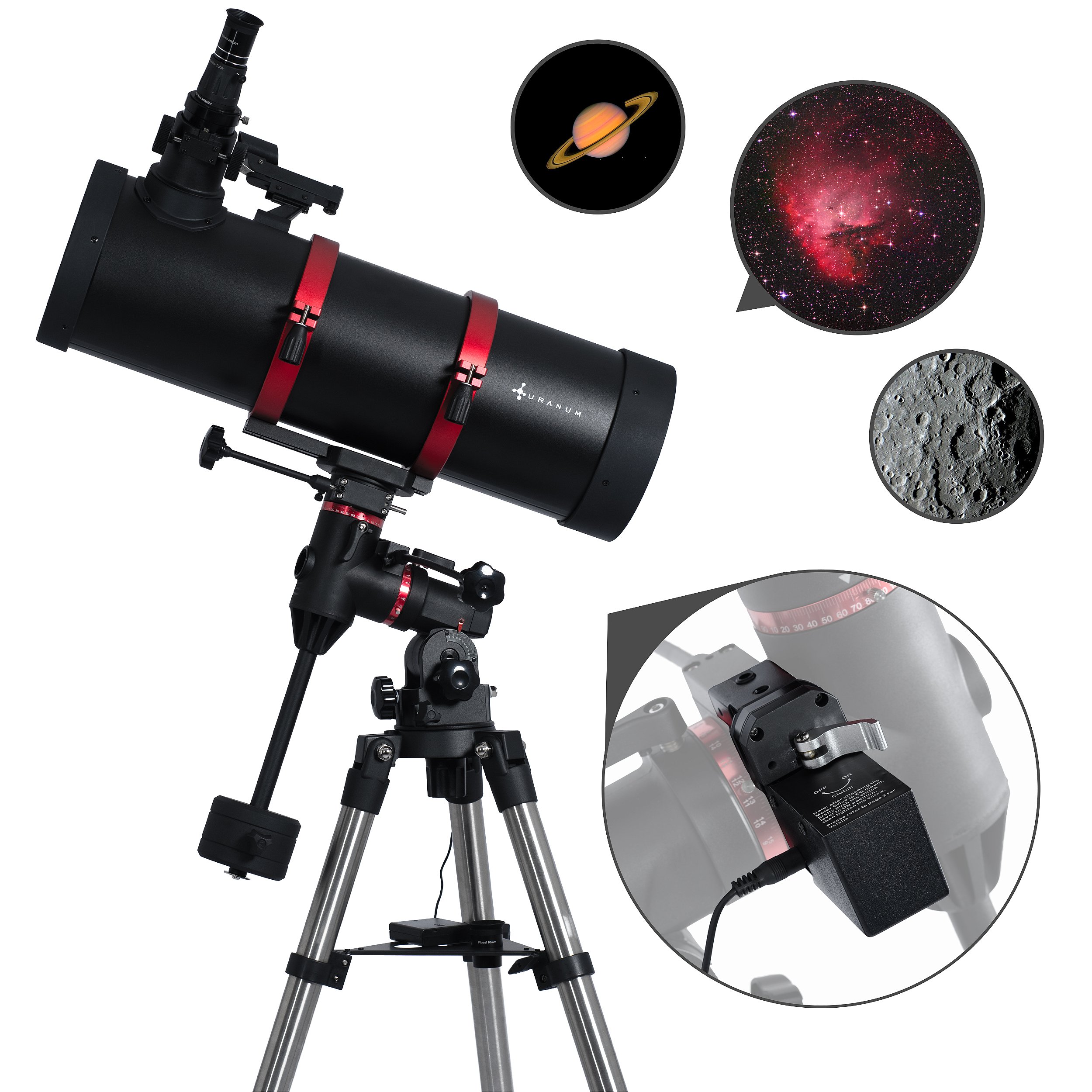 Seu espelho parabólico de 160mm de abertura e 800mm de distância focal proporciona excelente captação de luz, permitindo observar com nitidez planetas, crateras lunares, nebulosas e galáxias mais brilhantes.